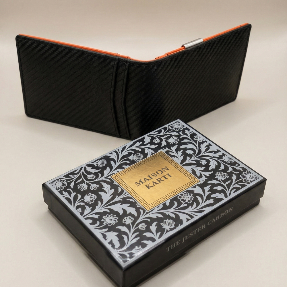 Jester is a bold, contemporary leather card holder designed for streamlined everyday carry. Defined by its striking dual-tone combination of carbon fibre texture and papaya orange, it brings a confident edge to a clean, compact silhouette.